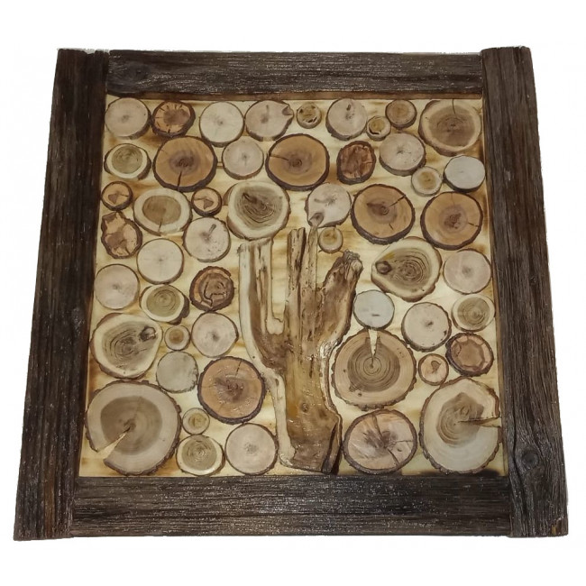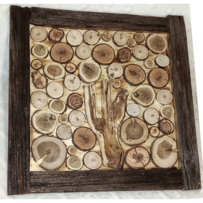 Tablou rustic handmade din rondele de lemn cu rama arsa si lacuita – 60x60 cm